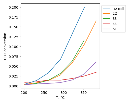 CO2 conversion is higher for sample, produced without ball-milling treatment. Selectivity to hydrocarbons is highest for sample with BN ball-milled at 22 b/s ratio at 200°C. However it is highest for non-milled sample at 380°C.