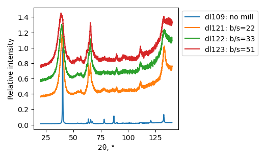 | dl109: no mill | dl121: b/s=22 | dl122: b/s=33 | dl126: b/s=44 | dl123: b/s=51 |