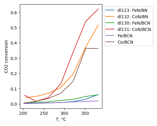 Co based catalysts are more active in comparison to Fe based ones. Also, Co-based catalysts posesses higher selectivity towards hydrocarbons. Among Fe-based catalysts, conversion decreases in the order Fe-N/BCN > Fe-N/BN > Fe/BCN. Selectivity towards hydrocarbons for these series is not changed substantially with temperature increase, although it shifts towards lower molecular weight hydrocarbons. Preferred product for Fe-based catalysts is CO. In case of Co-based catalysts covnersion decreases in the order Co-N/BCN > Co-N/BN > Co/BCN. Selectivity towards hydrocarbons is slightly higher for Co-N/BN sample at 200°C while it is highest for Co-N/BCN sample at 380°C. There is also shift towards lower molecular weight hydrocarbons with temperature increase for this series. Preferred product for Co-based catalysts is methane.